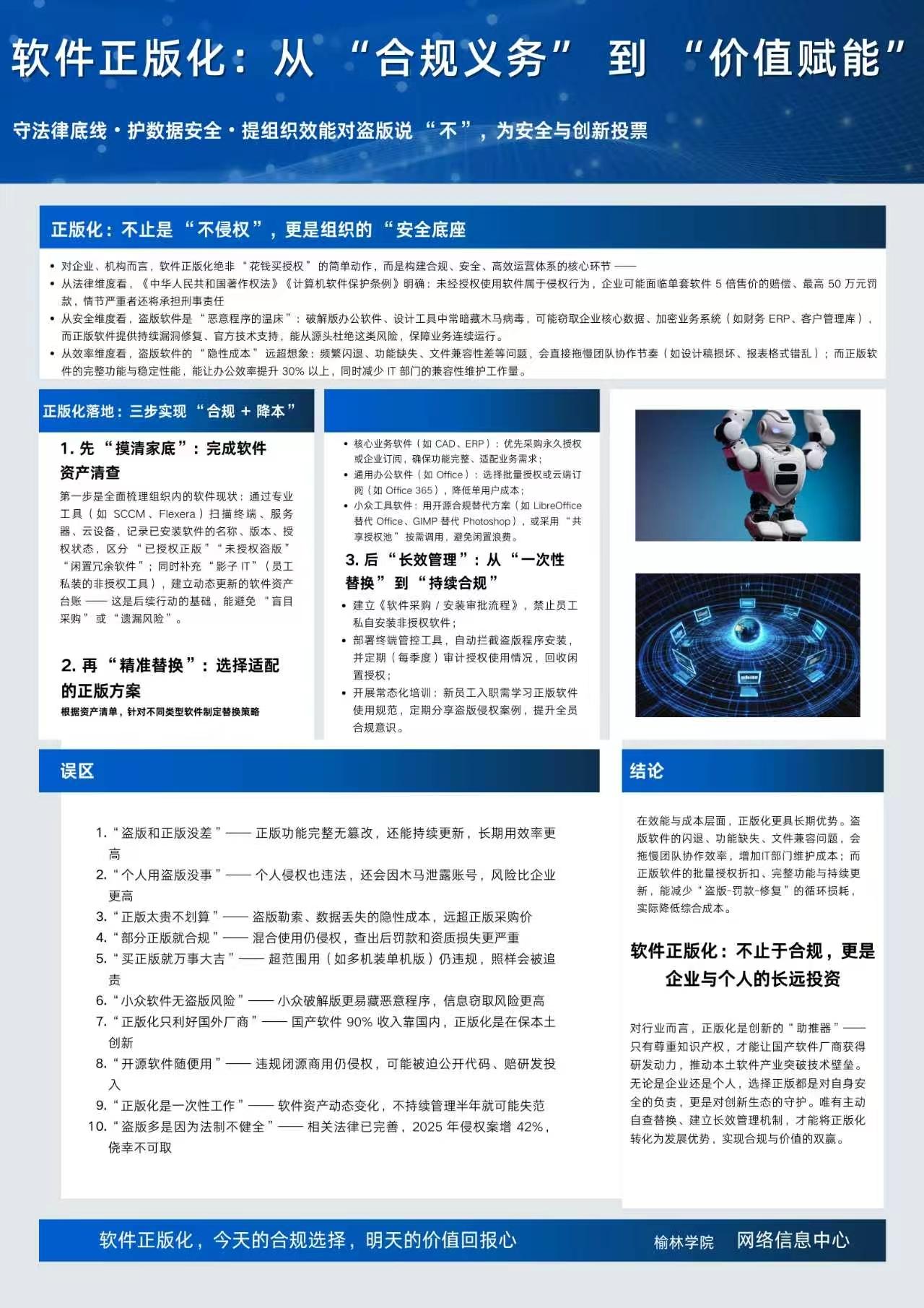 未来,学校将继续扎实推进软件正版化工作,完善正版软件服务保障机制,加强版权教育的常态化与长效化建设,为构建安全、合规、创新的数字校园环境贡献更大力量。
